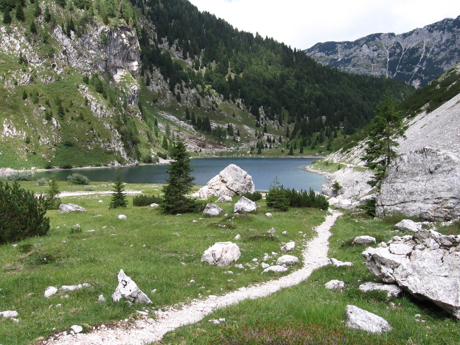 Krnsko jezero (tudi Veliko jezero ali Jezero na Polju) je največje slovensko visokogorsko jezero. Jezero je dolgo 390 m, široko 150 m in globoko 17,5 m. Pot na Krnsko jezero se prične na koncu doline Lepena, ob planinskem domu Klementa Juga. Mulatjera se vije večinoma preko gozda, ki nam v vročih poletnih mesecih zagotavlja senco. Steza se ob gornji postaji tovorne žičnice zravna in po 15 minutah pridemo do Koče pri Krnskih jezerih. Do jezera je še kakih 15 minut nezahtevnega sprehoda mimo leta 1997 opuščenih, a še vedno dobro ohranjenih pastirskih stanov na planini Duplje. Steza vodi preko opuščenih pašnikov do Krnskega jezera, ki velja za naše največje visokogorsko jezero. Leži na višini 1391 metrov, je 400 metrov dolgo in na najglobljem mestu globoko 17 metrov. Jezero skoraj popolnoma poplavlja kotanjo v vznožju Krna, na katerega se odpira pogled prav z jezerskega brega. Krnsko_jezero_panorama Takoj pod Kočo pri Krnskih jezerih najdemo še manjše Dupeljsko jezero. Dostop: Na označenem odcepu zavijemo v dolino Lepena in sledimo asfaltni cesti do Doma Klementa Juga, kjer na parkirišču pustimo avto. Čas: do Krnskega jezera potrebujemo 2.15 h hoje. Višinska razlika: 690 metrov.